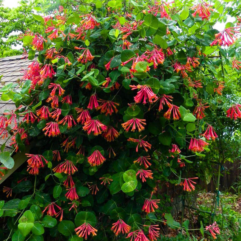 Prin florile sale spectaculoase, rosu-intens cu interior portocaliu, si inflorirea de lunga durata, Lonicera sempervirens ‘Blanche Sandman’ este o alegere excelenta pentru pergole, arcade, garduri vii decorative si fatade verzi.