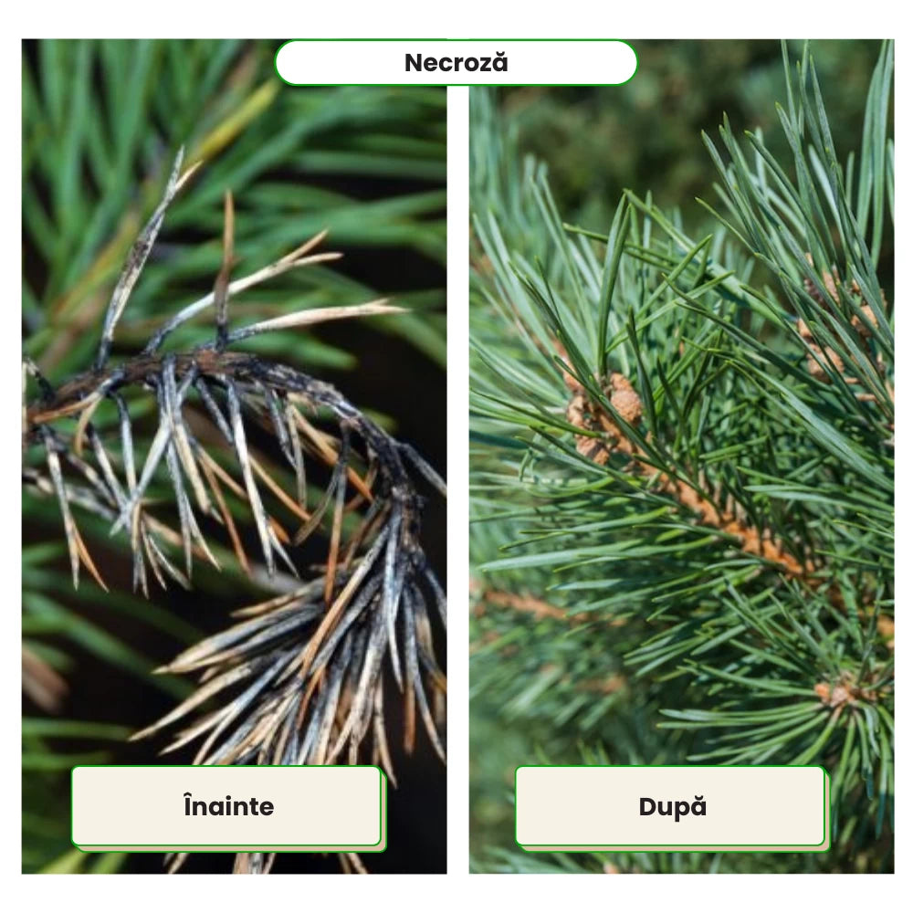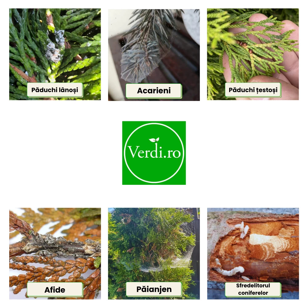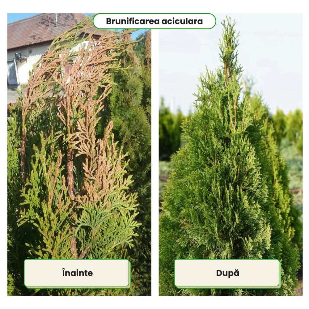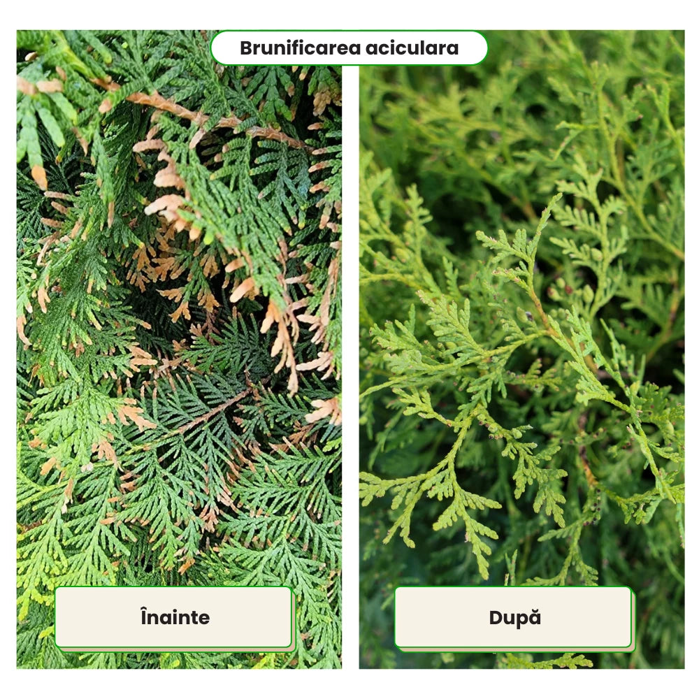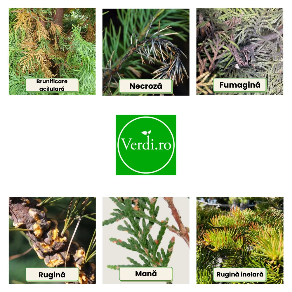 Mentine sanatoase specii precum tuia, bradul, molidul, ienuparul sau chiparosul. Acest set complet asigura creșterea si dezvoltarea armonioasa a plantelor tale conifere pe întreg anul.