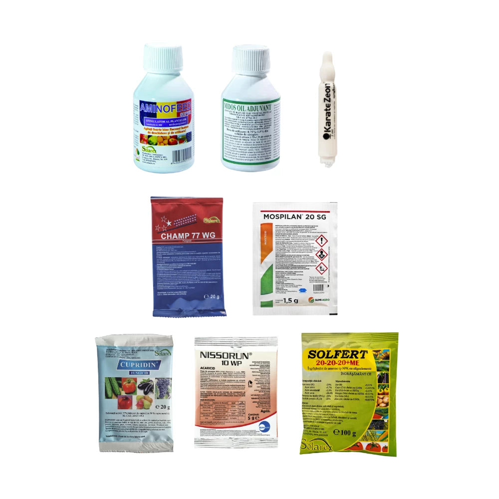 Pachetul de ingrijire si preventie pentru garduri vii contine elementele necesare de tratament pentru 100 m2-300 m2/10 L apa. Pachetul contine fungicide, fungicide-bactericide, insecticide, acaricide, adjuvanti, biostimulatori si ingrasamant pentru toate fenofazele plantei din perioada de toamna-iarna si acopera toata aceasta perioada.